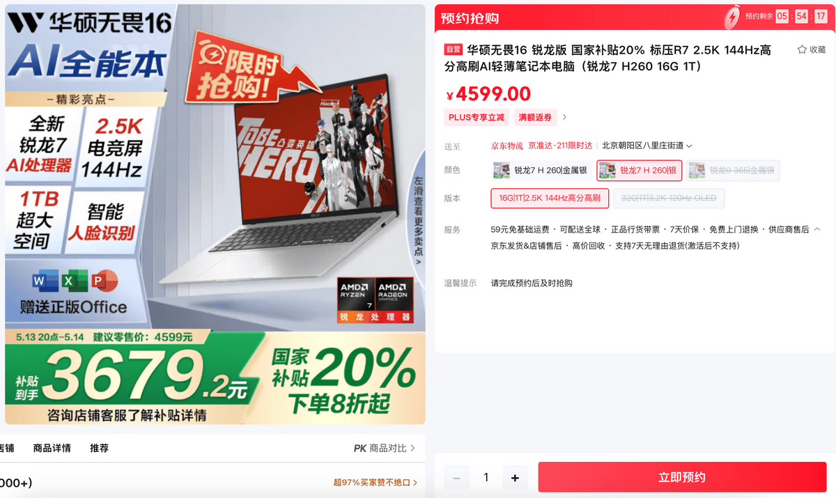 华硕无畏16 2025搭载AMD 锐龙7 H 260挪动处置器,杜绝现私泄露。带来更智能、舒服的交互体验。同时。